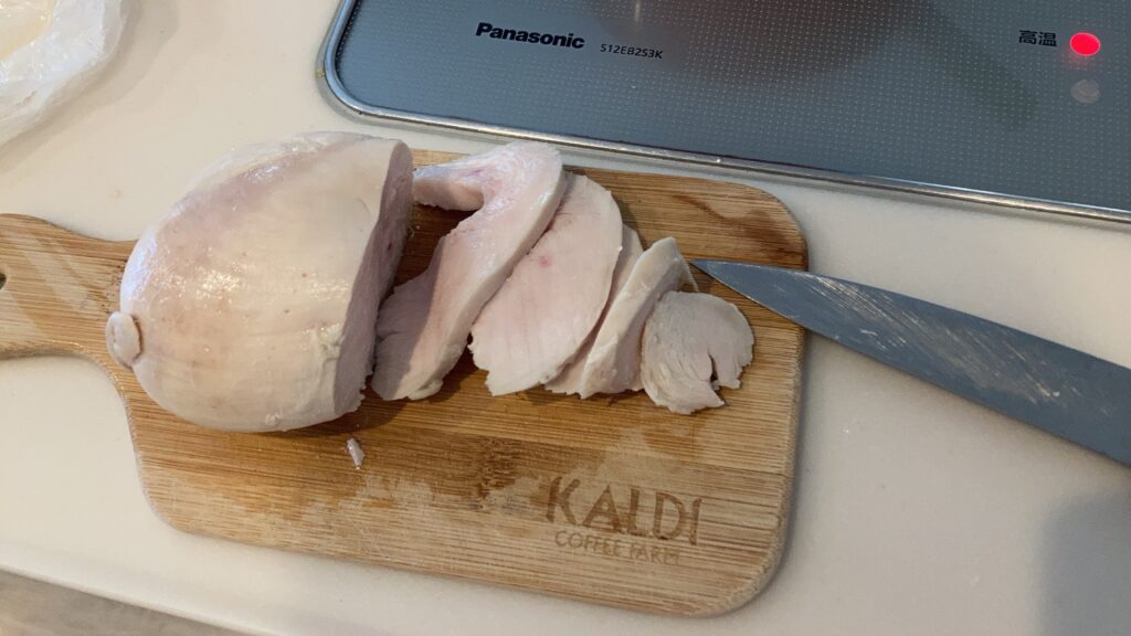 動画を観ながらサラダチキンに初挑戦、これにもにがりと米麴を少し混ぜてタレにしました。食べるのは一人作った人だけ。